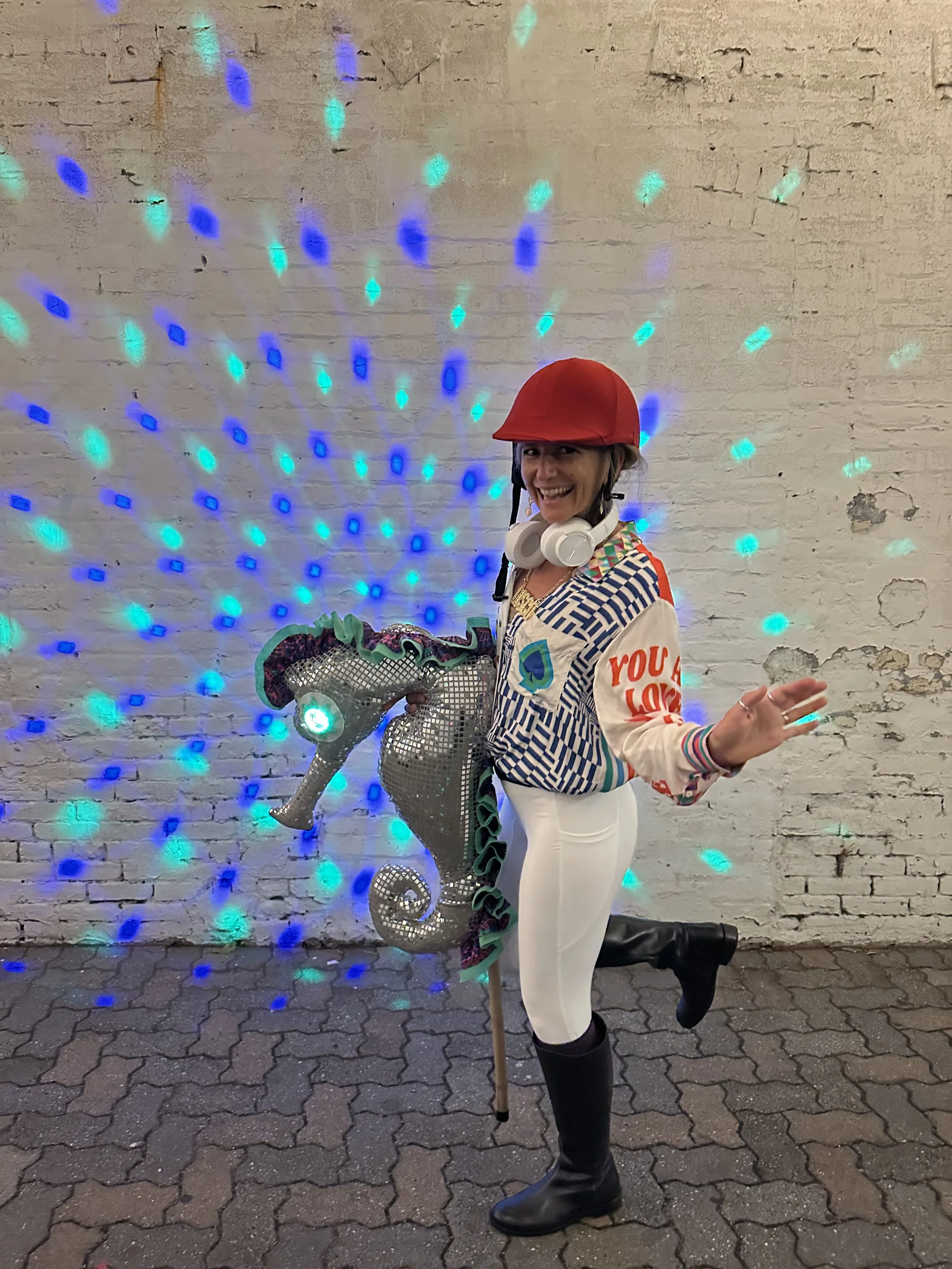 Image description: Amarisa rides a silver hobby seahorse with disco eyeballs casting a spray of blue and turquoise dots on a white brick wall. She glances playfully at the camera in her disco jockey attire: tall black boots, white riding pants, red helmet, white headphones around her neck, disco glam chain necklace, and silk jersey with exuberant patterns and the statement “YOU ARE LOVED” on the sleeve.