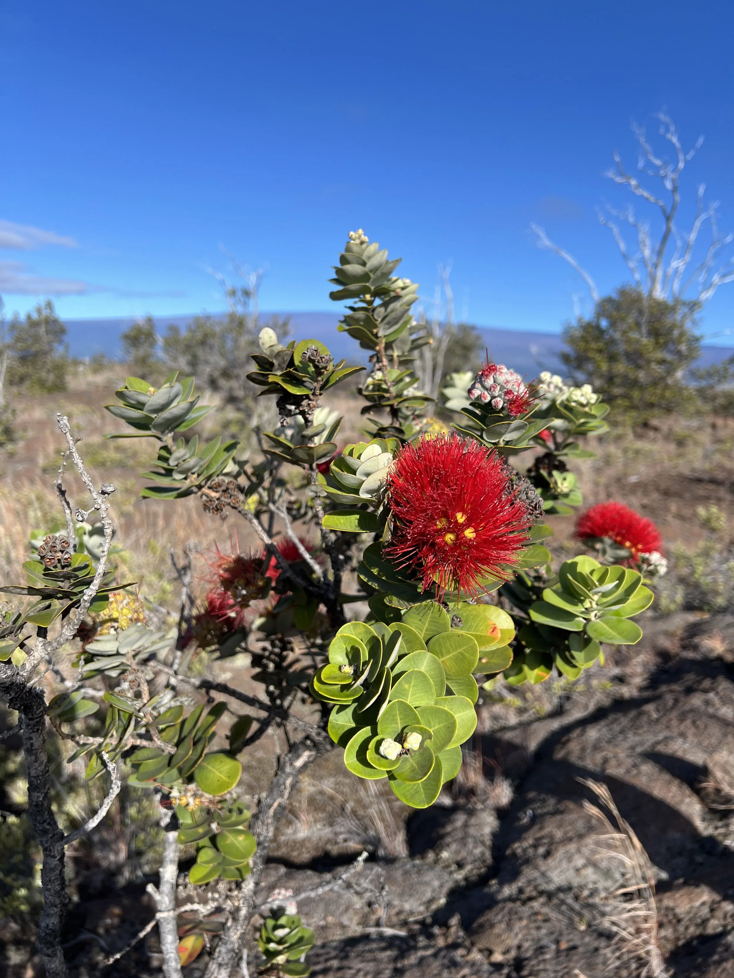 Image description: A bright red ‘ōhi’a lehua (Metrosideros polymorpha) rises out of lava in a sparse forest on Kīlauea volcano with Mauna Loa and bright blue skies in the background. The blossom tells the story of grit and strength, of resilience and growth.